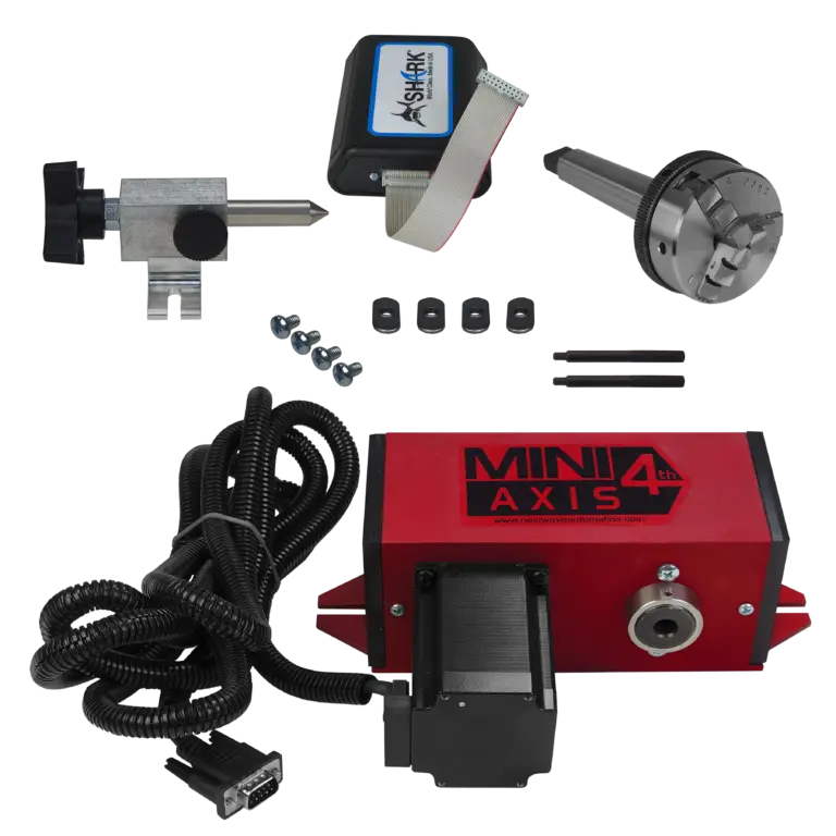 With virtually a plug-and-play design, the Mini 4th Axis Kit easily bolts to your SHARK CNC bed. The kit includes a removable mini 3 jaw chuck and features a standard #2 Morse taper shaft to allow you to use just about any of your standard lathe accessories.