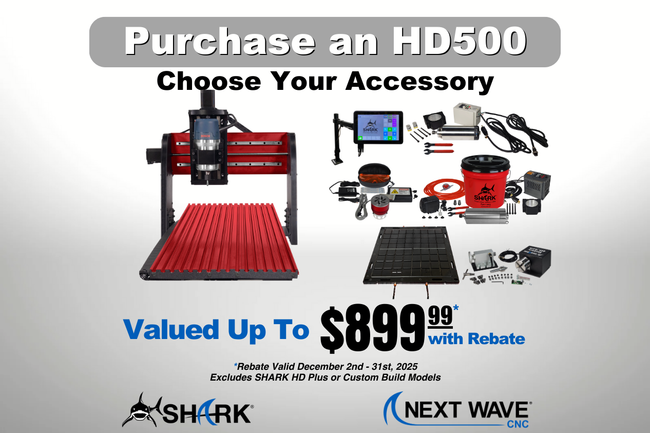 Next Wave CNC’s SHARK HD500® comes standard with everything you need to quickly get set up and running: the latest version of Vectric VCarve Desktop design software, a color pendant controller, 2 hold-down clamps, carbide V-bit, Next Wave Ready2Control Software, and Next Wave CNC’s exclusive, patented Virtual Zero Unlimited software.