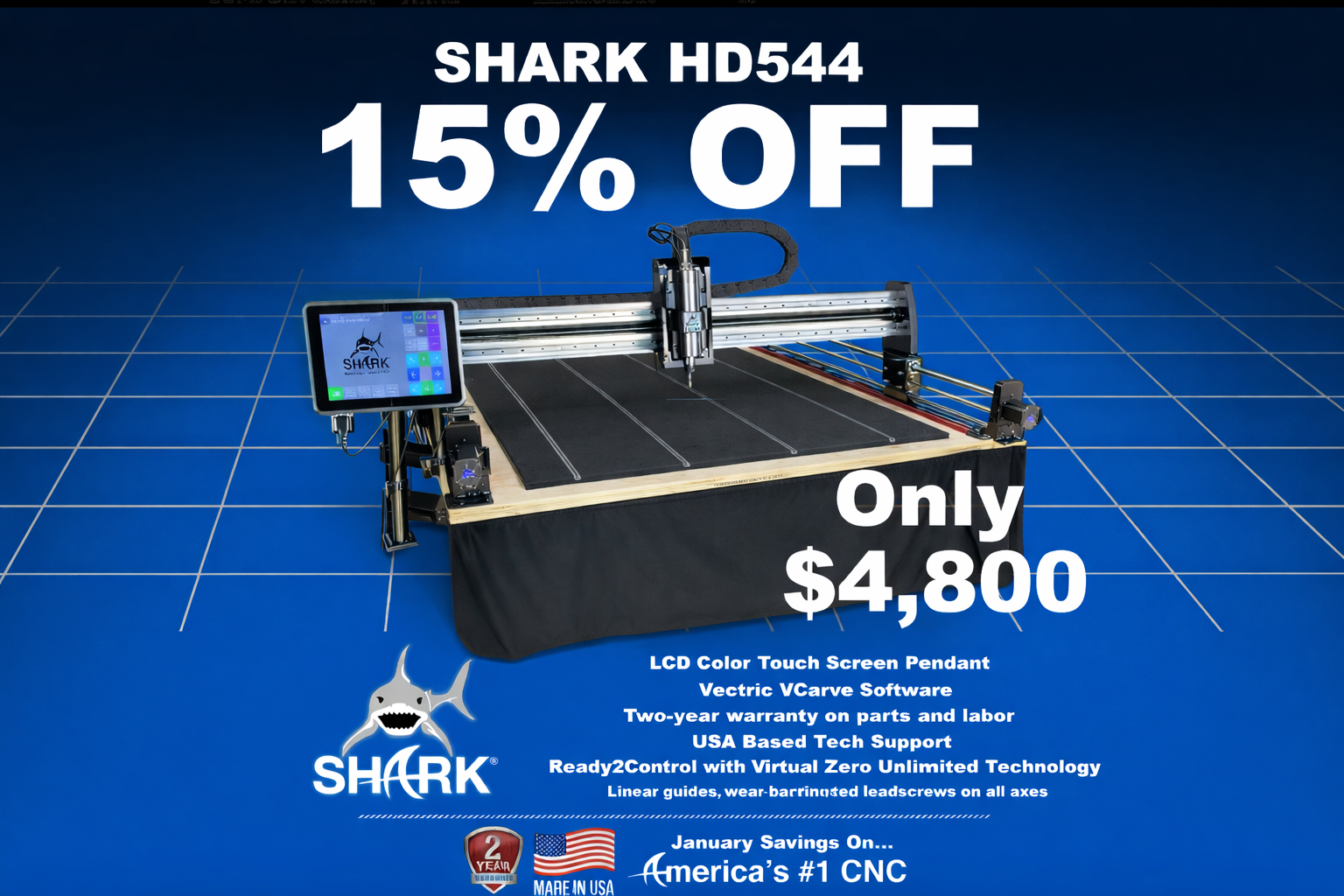 The Shark HD544® is ready to assemble and mounts to your minimum recommended 64” x 64” table (not included). The Shark HD544® includes a 3hp water cooled spindle, 10.1” color pendant controller, and features a closed loop system for higher accuracy, robust ultra-precision leadscrews on all axes, and our patented Virtual Zero Unlimited software.