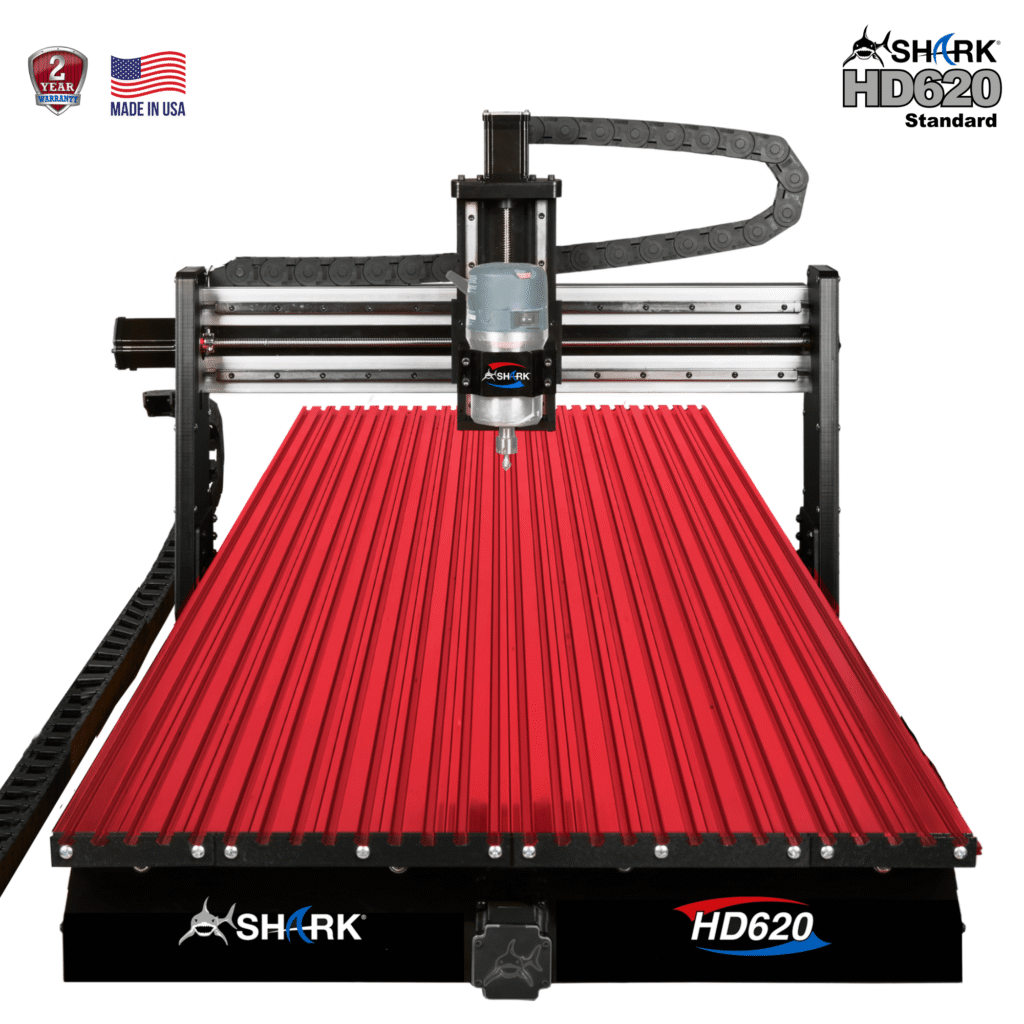 • Includes VCarve Pro Software ($699.99 Savings) • Aluminum InterLoc T-Slot Bed 28'' x 63” • XYZ travel: 25'' x 50'' x 7' • Overall dimensions: 36-1/4'' W x 63'' L x 24-1/2'' H SHARK® HD520 is fully compatible with the following routers (sold separately): Bosch 1617 and 1618 | Porter-Cable 890 Series | DeWalt 610, 616, 618 SKU 10024 $4999.99