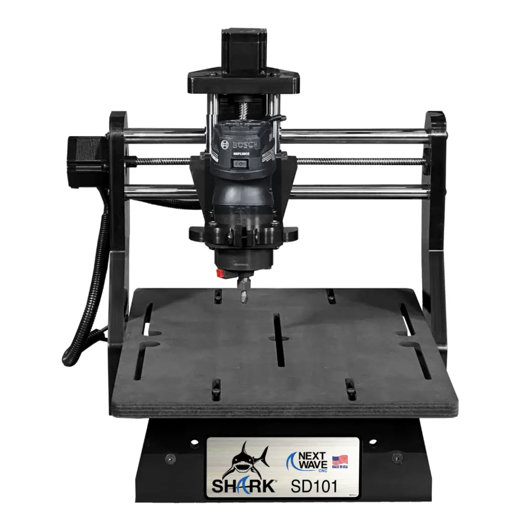 • Includes Wizard CNC Made Easy App • Ready2Control Basic Software • All black 15'' x 21" MDF bed with t-slots • XYZ travel: 12'' x 13'' x 4'' • Overall dimensions: 19-1/2''W x 20-1/2''L x 18''H • 1 Year Warranty • Eligible for our Shark Swap program *LCD Color Touch Screen Pendant not included *Virtual Zero not included Shark SD101® is fully compatible with the following routers (sold separately): Bosch 1 HP Model PR20 | Dewalt 611 | Porter Cable 450 or similar style palm router SKU 10027 $799.99