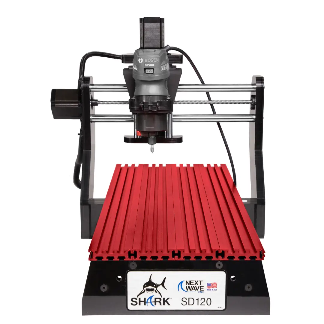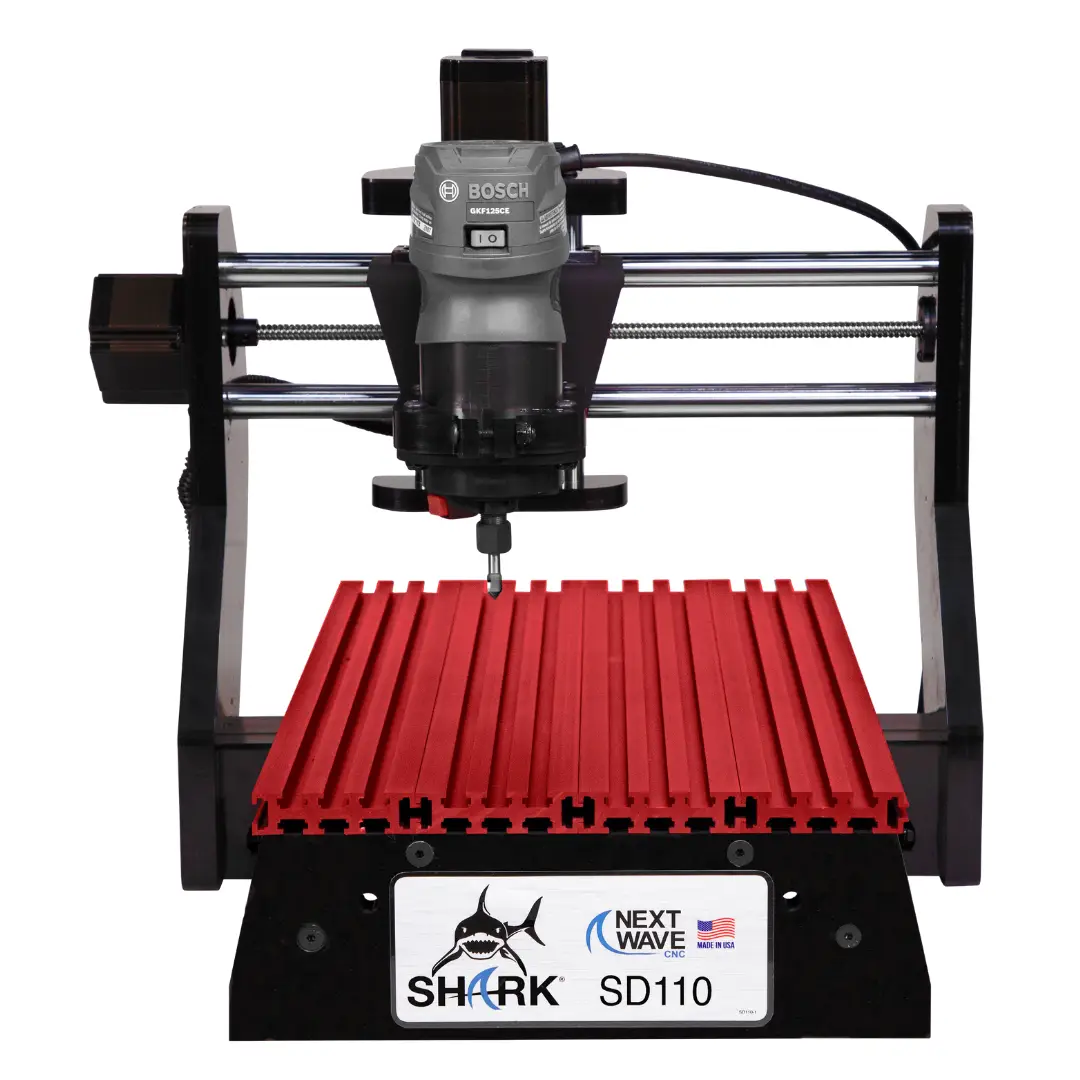 • Includes Vcarve Desktop Software • Aluminum InterLoc T-Slot Bed 12'' x 18" • XYZ travel: 12'' x 13'' x 3'' • Overall dimensions: 19-1/2''W x 20-1/2''L x 18''H Shark SD110® is fully compatible with the following routers (sold separately): Bosch 1 HP Model PR20 | Dewalt 611 | Porter Cable 450 or similar style palm router SKU 10001 $1,499.99